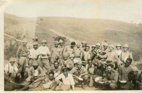 Fotografia preto e branco de combatentes em momento de refeição com seus pratos e talheres em mãos, alguns se posicionam em pé, outros sentados e ou de cócoras. Ao fundo paisagem da região.
