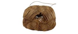 Chocalho confeccionado a partir de rede de fibra natural trançada, finalizada com cinco cabaças pequenas, pintadas nas cores verde, amarelo e vermelho.