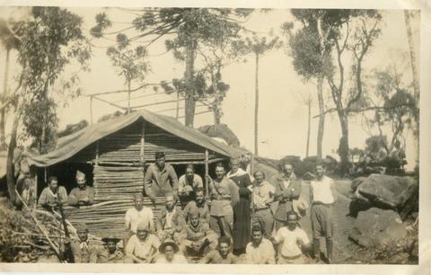 Fotografia preto e branco de dezenove soldados, tendo ao centro a presença de um clérigo com batina preta, ao fundo alojamento feito com galho de árvore e coberto por lona em meio a vegetação.